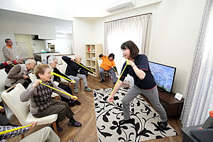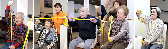 「カラオケ?!」と、入居者の方の最初の反応がいまひとつだったので、まずエクササイズがメインのプログラムから始めました。「セラバンド」というゴム状のものを使って筋トレ。これが意外に反応が良く、みなさんノリノリに。