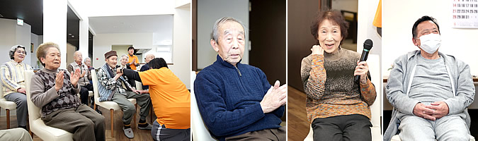 そこに、本日のスペシャルゲストをお迎え~。スタッフの一人が「みそしる」を熱唱!これには入居者のみなさんもビックリ。スタッフの体を張った、”みなさんに楽しんでもらいたい!”という気持ちが伝わりました。「一歳でも若く見せられるように健康で頑張る!」ために、大きな声で歌うのは効果が高いのです。普段、それぞれのお部屋にいると大きな声を出すことは少ないですよね。今年は、さまざまなイベントで、大きな声で笑っていただけるようにスタッフも企画を練っていきます。期待してくださいね!