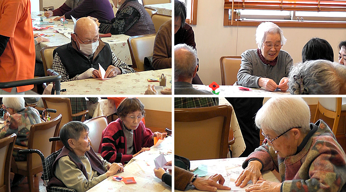 今回のイベントは、「おりがみ」。ハーウィル栗橋に併設のデイサービス「ほっと・ケアライフデイサービス」で第1月曜日におりがみを楽しむ教室があります。『おりひめ会』というボランティアの方達が指導してくれているのです。そこで、ハーウィル栗橋の入居者のみなさんにも体験していただくこうと企画しました。
