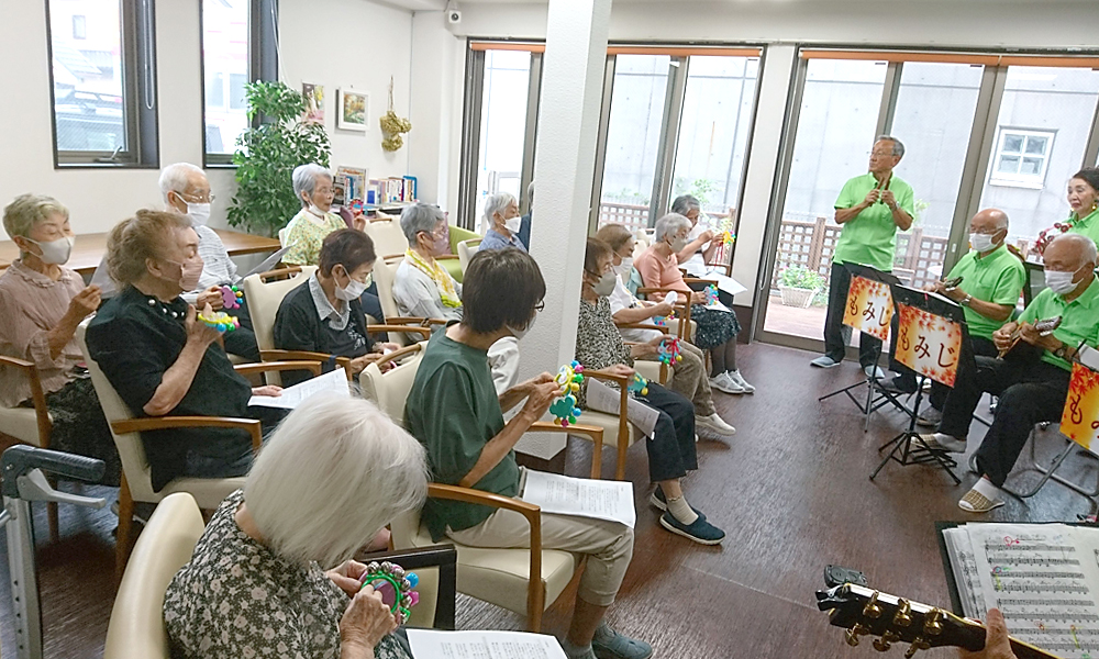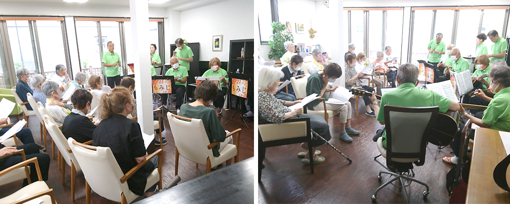 「もみじ」さんは、毎回入居者の皆さんに馴染みのある曲を選んで演奏してくださるので、参加者の皆さんからは自然と手拍子が起きたり、一緒に歌い始める方もいたりと、温かい雰囲気が広がります。