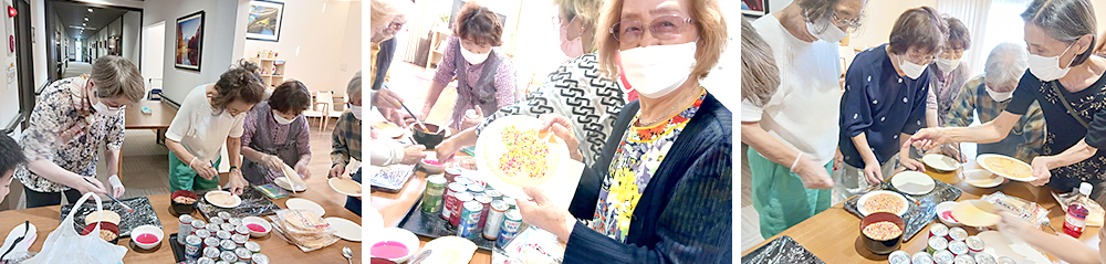 最後は「落書きせんべい作り体験」。大きなエビせんにカラフルなチョコやシロップで自由にお絵描きし、そのままパクリ。「美味しい!」と笑顔がこぼれ、おかわりをする方も!手作りお菓子で、夏祭りは最後まで盛り上がりました。