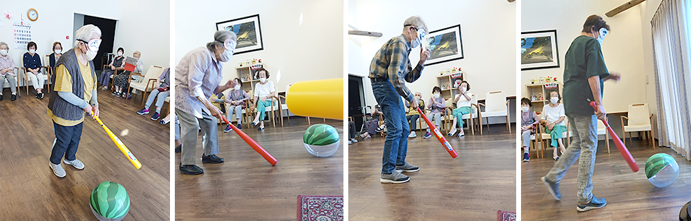 まずはビーチボールをスイカに見立てた「スイカ割り」。目隠しをしているので、周りの掛け声を頼りに挑戦します。「そっちじゃなくて、右!」「もうちょっと前!」と声が飛び交いますが、なかなか命中させるのは難しい…!お茶目なアイマスクも相まって、応援の声と笑いが絶えず、会場は終始にぎやかでした。